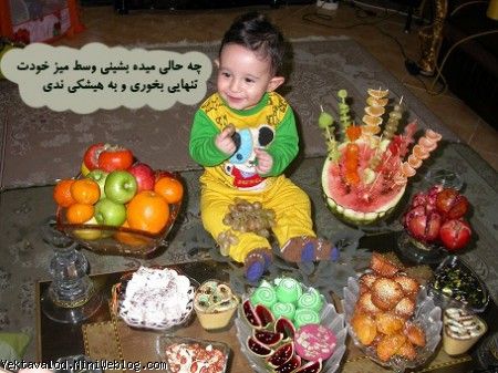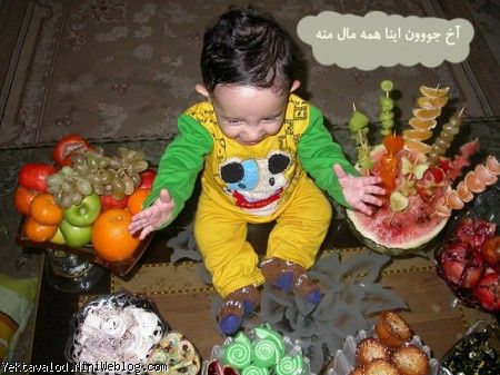 مامان ایلیا از همون روز قبلش برنامه هاشو واسه شب چله آماده سازی کرد و مارو هم بسیج کرد تا مواد لازم و اعمال لازم رو مهیا و عملی کنیم البته چون شب چله امسال مصادف شد با ایام سوگواری و رحلت پیامبر و آخر صفر ، تصمیم گرفتیم تنها میز شیرینی و میوه ای تدارک ببینیم و از تزیینات خونه و نور افشانی و موزیک و حرکات جلف !! صرفه نظر کنیم و لذت تجربه اولین شب چله پسرمون رو ، با درست کردن شیرینی و دسر واسه مامانش خاطره ساز کنیم و بس!